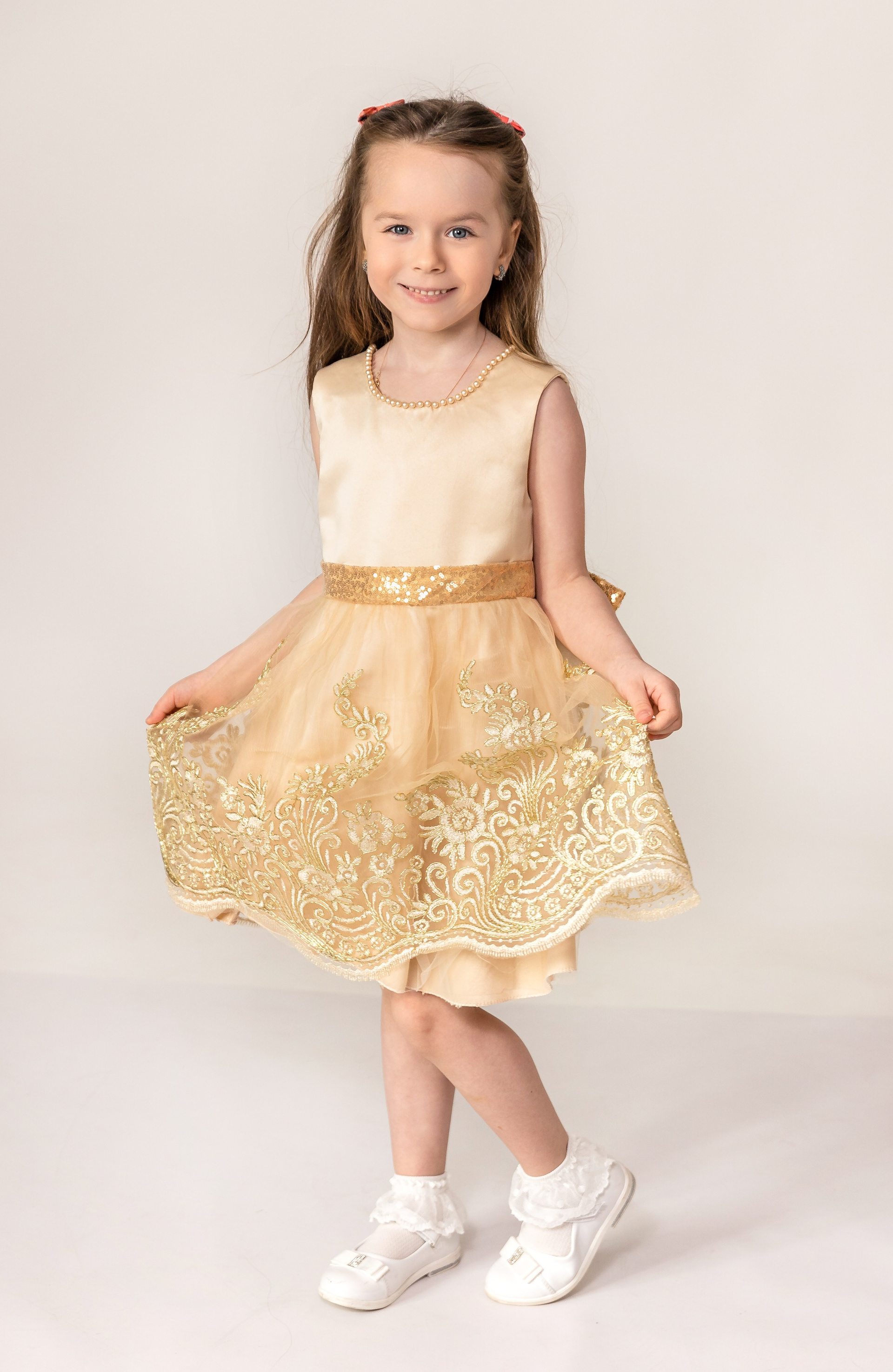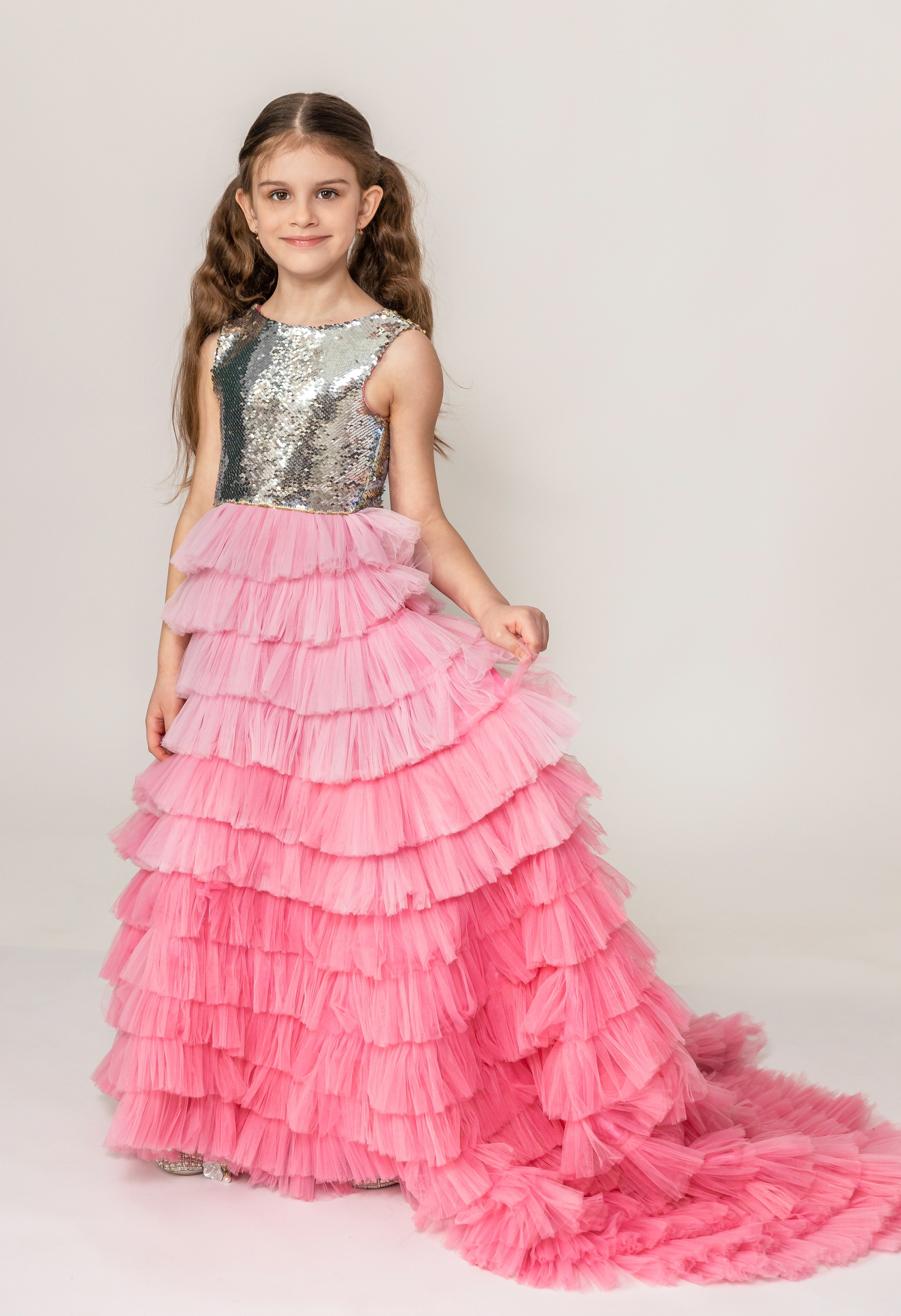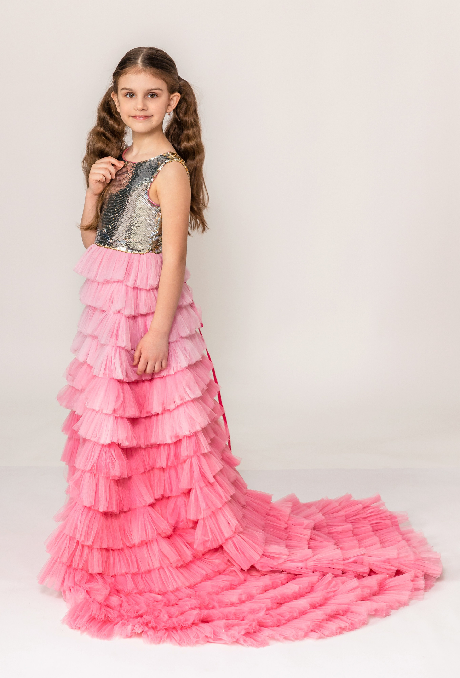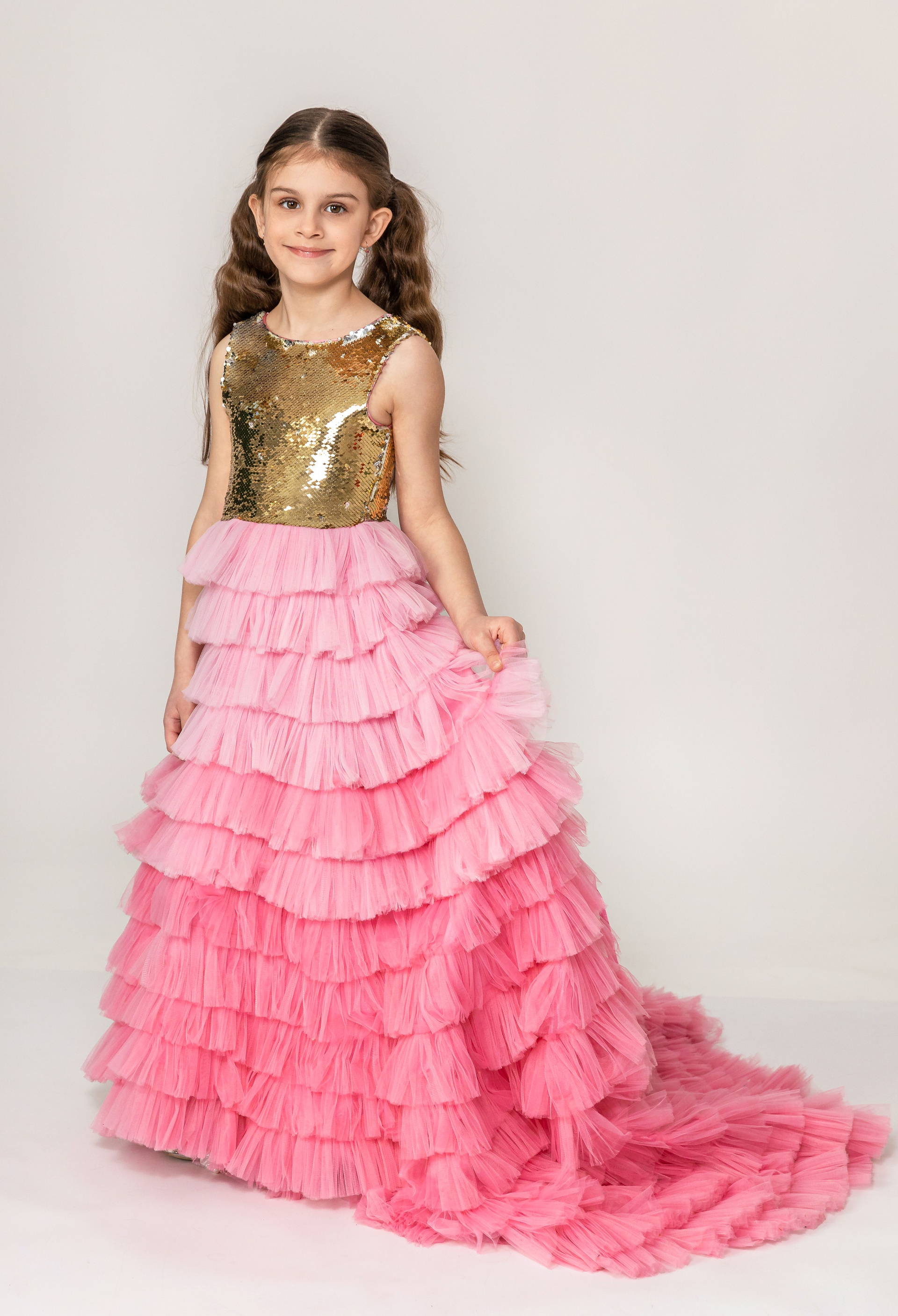 платье для девочки, розовый низ со шлейфом, золотой верх с пайетками