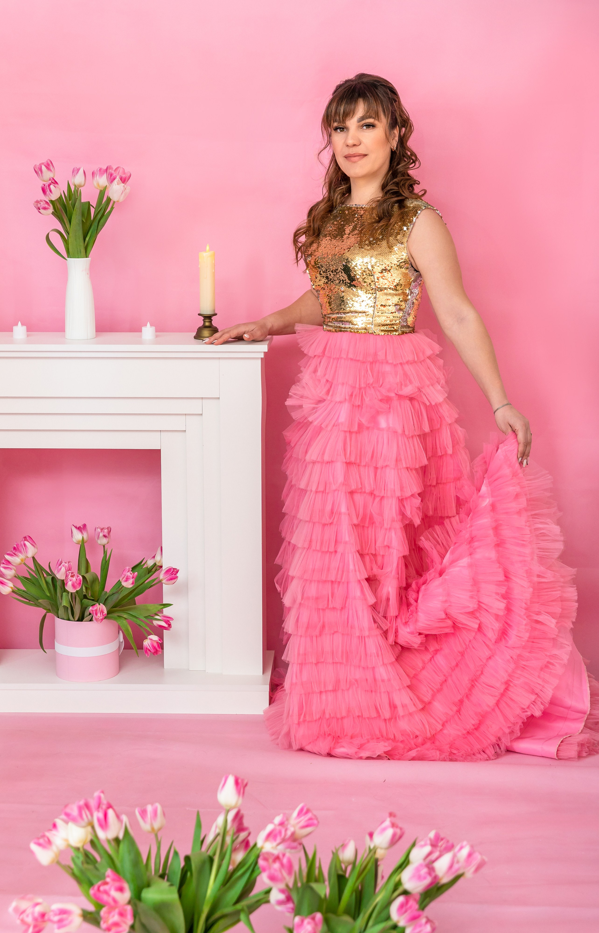 платье женское, розовый низ со шлейфом, золотой верх с пайетками